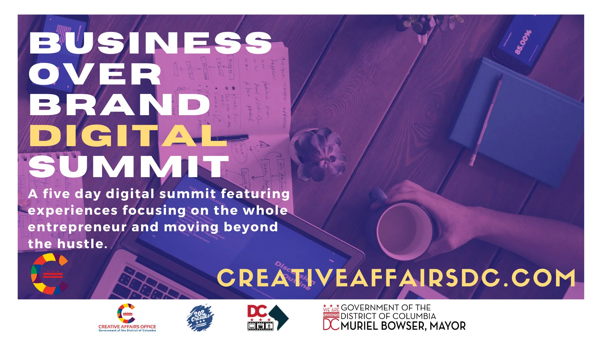 The Business Over Brand (BOB) Hybrid Summit is a five day hybrid summit featuring in-person and digital experiences focusing on creativity, entrepreneurship and moving beyond the hustle. Business Over Brand improves access to actionable information, education and support for the District’s creatives to better understand their why, build their business, and grow their brand.